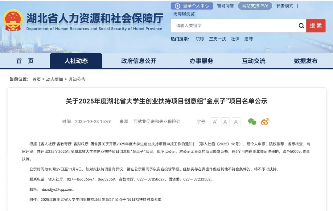 近日,湖北省人力资源和社会保障厅公布了2025年度湖北省老员工创业扶持项目创意组“金点子”项目拟扶持对象名单,公司1个项目入围。省人社厅将对6个月内在湖北登记注册公司的项目给予5000元/项资金扶持。
