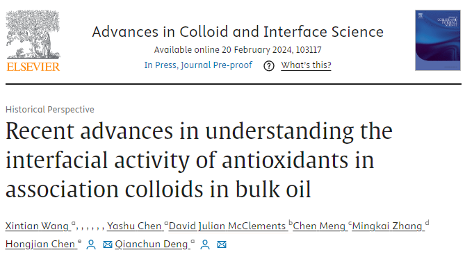 导读:2024年2月,伟德国际1949陈洪建博士作为第一通讯作者在国际食品Top期刊《Advances in Colloid and Interface Science》(Q1,IF: 15.6)发表题为“Recent advances in understanding the interfacial activity of antioxidants in association colloids in bulk oil”的综述论文。中国农业科公司油料作物研究所博士研究生王新天为第一作者,通讯作者为伟德国际1949陈洪建特任副研究员和中国农业科公司油料作物研究所邓乾春研究员。